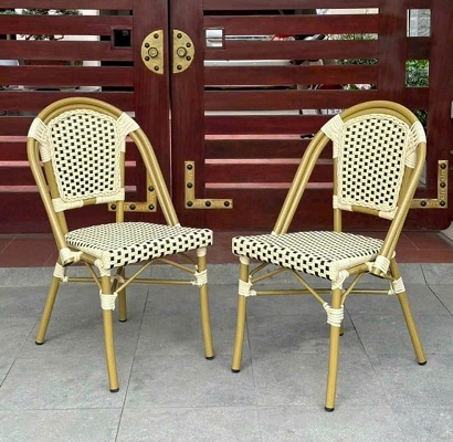 - Chất liệu : Khung ghế nhôm đúc sơn tĩnh điện ngoài trời 3 lớp màu vàng đồng. Lớp ngoài cùng được phủ sơn bóng chống tia UV. Mặt ngồi và tựa lưng ghế được căng nhựa đan giả mây, hàng ngoài trời với độ bền trên 10 năm.