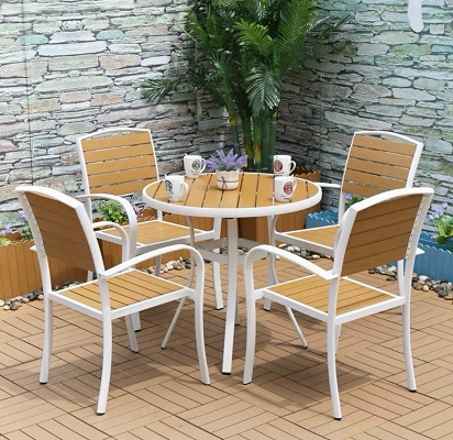 Màu sắc: Bàn và Ghế khung nhôm sơn tĩnh điện trắng, nan nhựa polywood màu giả gỗ